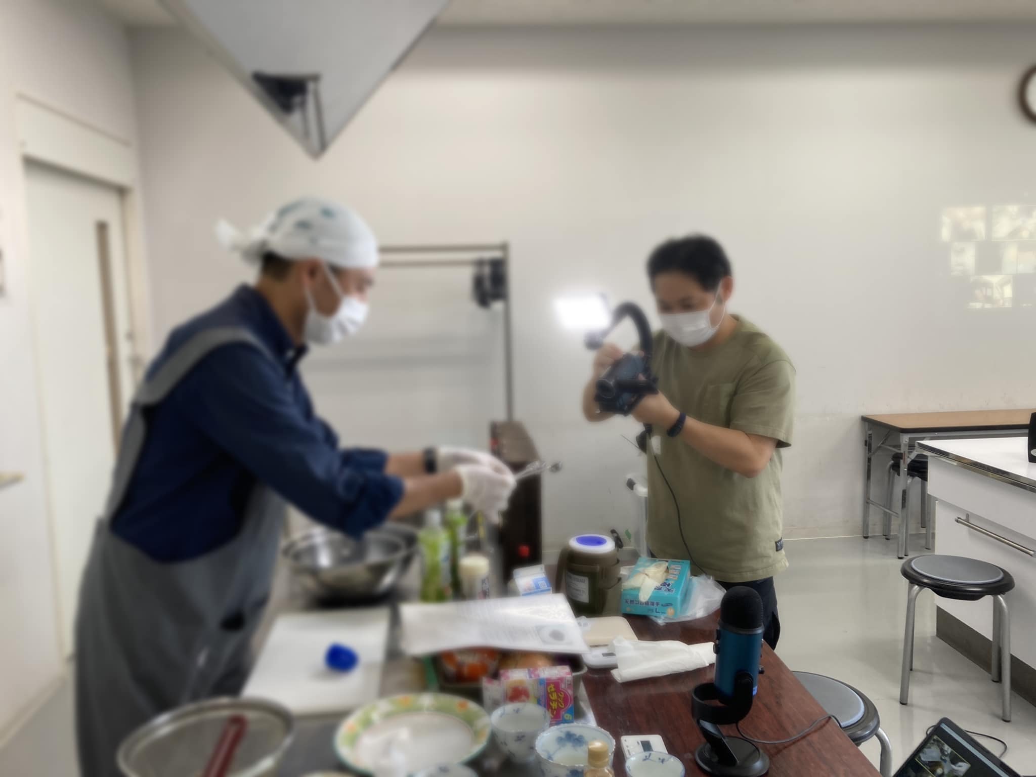 桜木公民館調理室から配信、オンラインでスクール生のパパたちを繋ぎ、ご自宅のキッチンで家族で食べるランチを作って頂く企画。