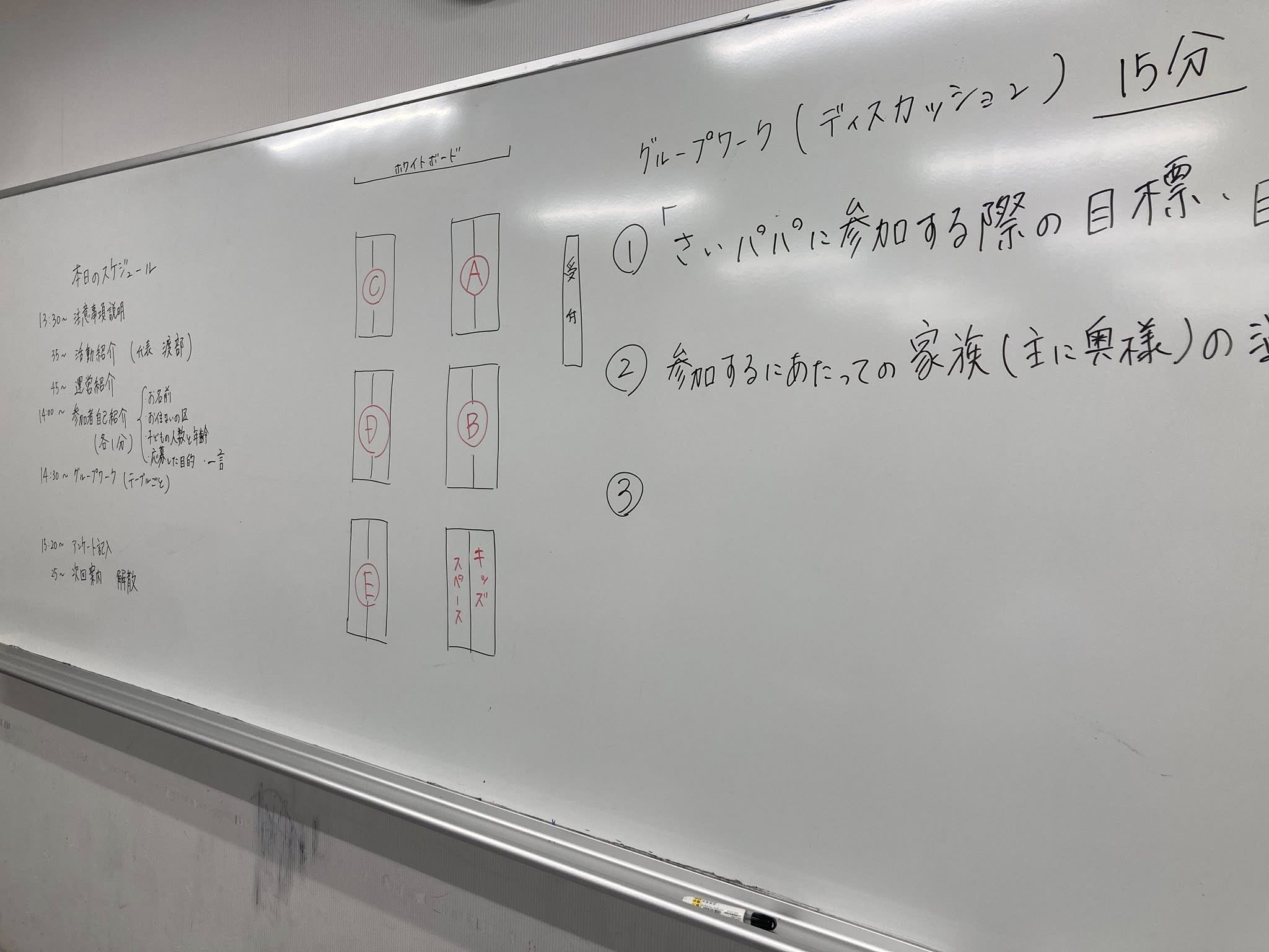 受付後、パパ年齢別にグループを分けました。そして冒頭に代表挨拶、さいパパという団体、その目指すもの、歴史などをスライドをお見せしながらご説明しました。その後、運営メンバーの自己紹介(これが毎回長い!)そして、今回の受講者おひとりおひとりに自己紹介をしていただきまました。緊張した面持ちでしたが、子連れの方が多かったという事もあり、和やかに進みました。その後はグループごとにさいパパに入った目的、奥さんの反応など、共有していただきました。子ども連れの方が多かったという事もあってか、とても賑やかに楽しくお話いただけたようです。第2回も楽しみです。
