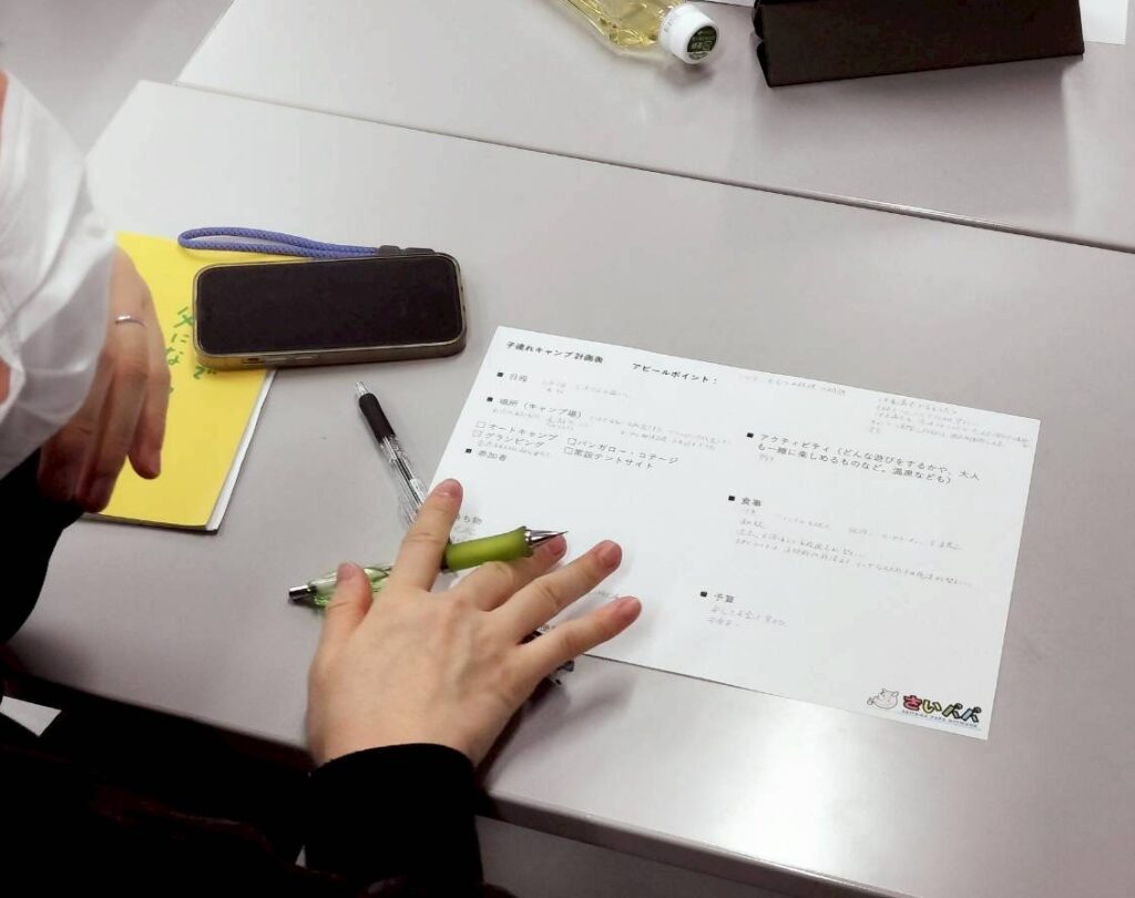 初心者キャンプの注意点、子連れキャンプ体験のメリット、子育てに役立つ点、おすすめキャンプ場などをスライドを使ってお話した後、各グループごとに仮の家族キャンプ計画を立ててもらい発表してもらいました。