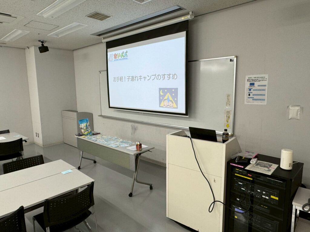 「子連れキャンプのすすめ」という通り、キャンプ未経験者でもやってみようと思えるようなお話を、アウトドア好きな運営メンバーが資料を示しながらお話いたしました。